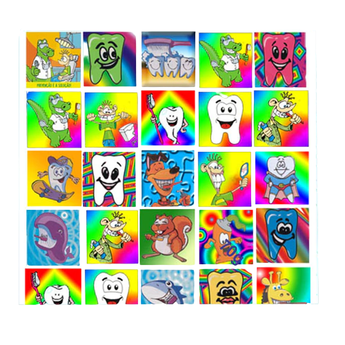 Adesivos com Motivos Odontológicos, cada um tem aproximadamente 4 centímetros.