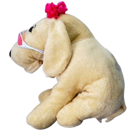 Uma cachorrinha muito simpática e divertida. Possui um laço rosa na cabeça, um óculos escuro e olhos pintados.