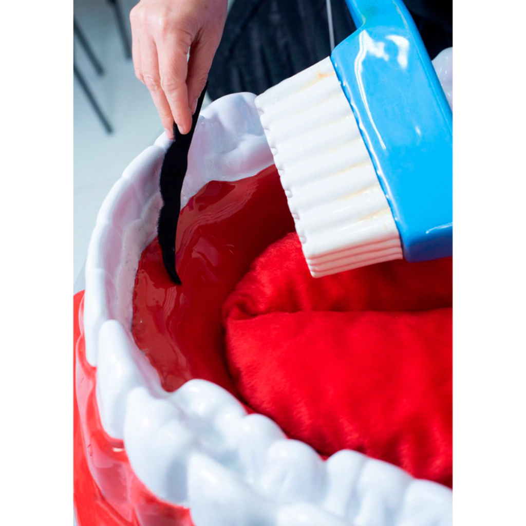 O Kit Hiper Bocão é composto de caixa plástica com tampa, 4 rodízios para transporte, 2 alças metálicas, estampa em 4 cores com temas decorativos de saúde bucal com personalização da Instituição, medindo 60 x 60 x 100 cm, 1 boca composta de arcada superior e arcada inferior, 32 dentes fixos com finalidades demonstrativas de técnicas de higienização medindo 67 x 47 x 57 cm, confeccionada com homopolímero poliestireno expandido, 1 língua aveludada medindo 50 x 30 x 10 cm, 1 cálculo (tártaro) demonstrativo na região lingual dos incisivos inferiores, 1 placa bacteriana demonstrativa na região oclusal do terceiro molar inferior esquerdo, 1 escova dentária gigante de poliestireno expandido medindo 85 x 08 x 15 cm e 1 fio dental demonstrativo gigante medindo 23 x 26 cm.