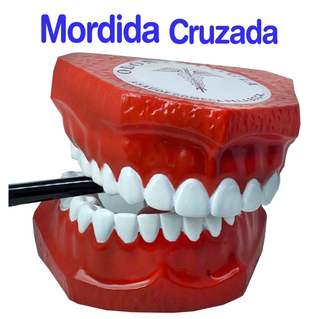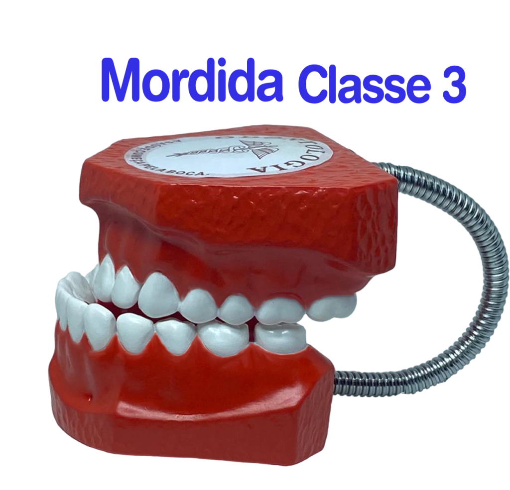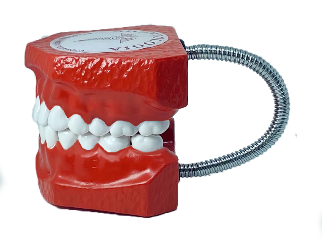 Macro Modelo Escovação com arcada superior, arcada inferior e articulador metálico flexível, que permite posicionar na oclusão tipo I, oclusão tipo II, oclusão tipo III e mordida cruzada. Ideal para treinamento de escovação dentária e uso de fio dental.